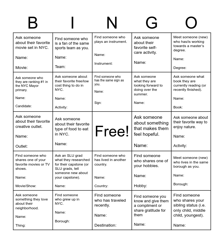 This bingo card has a free space and 24 words: Ask an SLU grad what they researched for their capstone (or SLU grads, tell someone new about your capstone). Name:, Find someone who grew up in NYC. Name: Borough:, Find someone who has the same sign as you. Name: Sign:, Ask someone something they love about their neighborhood. Name: Thing:, Meet someone (new) who has/is working towards a master’s degree. Name: Degree:, Ask someone about their favorite movie set in NYC. Name: Movie:, Ask someone who they are ranking #1 in the NYC Mayor primary. Name: Candidate:, Find someone who is a fan of the same sports team as you. Name: Team:, Ask someone about something that makes them feel hopeful. Name:, Find someone who has lived in another country. Name: Country:, Ask someone what they are looking forward to doing over the summer. Name:, Ask someone about their favorite creative outlet. Name: Outlet:, Find someone who shares one of your hobbies. Name: Hobby:, Meet someone (new) who lives in the same borough as you. Name: Borough:, Ask someone about their favorite free/low cost thing to do in NYC. Name: Activity:, Find someone you know and give them a compliment or share gratitude for them Name:, Ask someone about their favorite way to enjoy nature. Name: Activity:, Find someone who plays an instrument. Name: Instrument:, Ask someone what book they are currently reading (or recently finished). Name: Book:, Ask someone about their favorite type of food to eat in NYC. Name:, Find someone who shares your sibling status (i.e. only child, middle child, youngest). Name:, Find someone who shares one of your favorite movies or TV shows. Name: Movie/Show:, Ask someone about their favorite self-care activity. Name: and Find someone who has traveled recently. Name: Destination:.