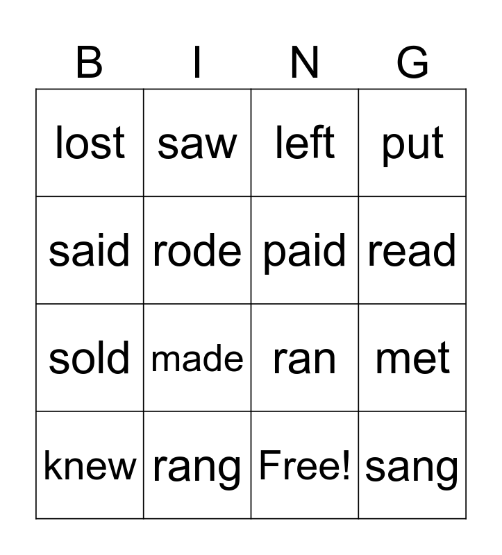 This bingo card has 17 words: Free!, knew, left, lost, made, put, met, paid, read, rode, rang, ran, said, saw, sold, sent and sang.