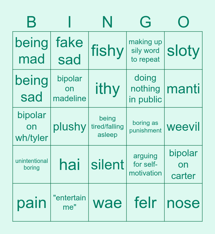 This bingo card has 25 words: hai, wae, ithy, pain, sloty, being mad, being sad, fake sad, boring as punishment, silent, doing nothing in public, bipolar on wh/tyler, arguing for self-motivation, bipolar on carter, bipolar on madeline, nose, weevil, fishy, manti, plushy, being tired/falling asleep, "entertain me", unintentional boring, making up sily word to repeat and felr.