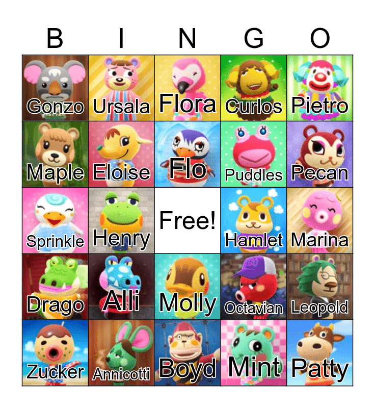This bingo card has 24 images, a free space and 24 words: Alli, Annicotti, Flo, Zucker, Pietro, Gonzo, Maple, Ursala, Hamlet, Molly, Puddles, Sprinkle, Octavian, Leopold, Eloise, Mint, Marina, Flora, Pecan, Henry, Patty, Drago, Curlos and Boyd.