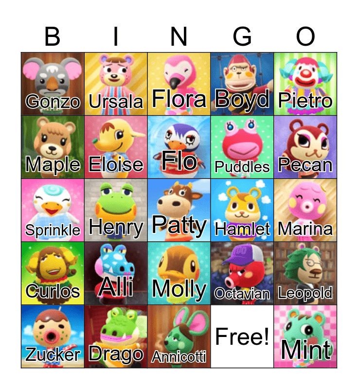 This bingo card has 24 images and 25 words: Alli, Annicotti, Flo, Zucker, Pietro, Gonzo, Maple, Ursala, Hamlet, Molly, Puddles, Sprinkle, Octavian, Leopold, Eloise, Mint, Marina, Flora, Pecan, Henry, Patty, Drago, Curlos, Boyd and Free!.