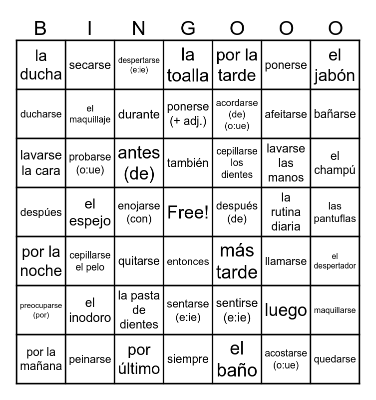 This bingo card has a free space and 55 words: el baño, el champú, la crema de afeitar, la ducha, el espejo, el inodoro, el jabón, el lavabo, el maquillaje, la pasta de dientes, la toalla, el despertador, las pantuflas, la rutina diaria, por la mañana, por la noche, por la tarde, acordarse (de) (o:ue), acostarse (o:ue), afeitarse, bañarse, cepillarse el pelo, cepillarse los dientes, despertarse (e:ie), dormirse (o:ue), ducharse, enojarse (con), irse, lavarse la cara, lavarse las manos, levantarse, llamarse, maquillarse, peinarse, ponerse, ponerse (+ adj.), preocuparse (por), probarse (o:ue), quedarse, quitarse, secarse, sentarse (e:ie), sentirse (e:ie), vestirse (e:i), antes (de), despúes, por último, más tarde, después (de), durante, entonces, luego, siempre, también and tampoco.