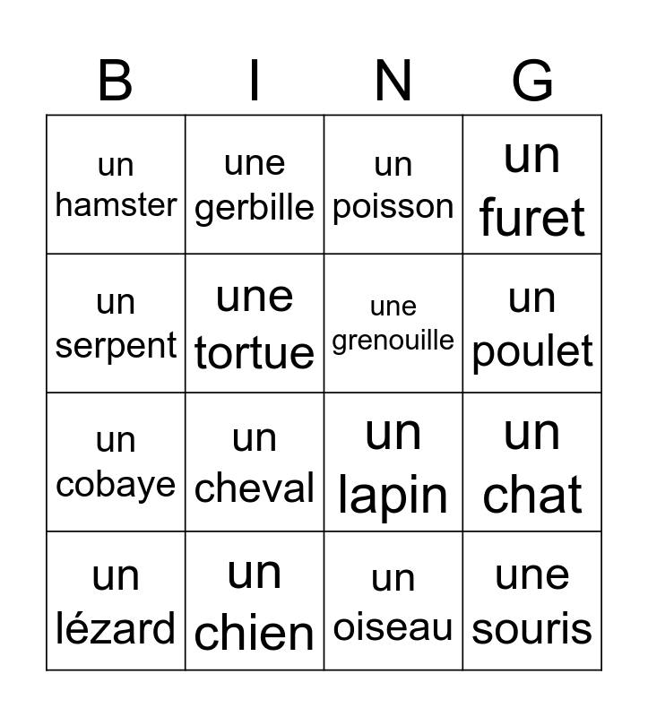 This bingo card has 16 words: un chien, un chat, un poisson, un hamster, un cobaye, une gerbille, un lapin, un oiseau, un serpent, une tortue, un lézard, un furet, un cheval, un poulet, une grenouille and une souris.