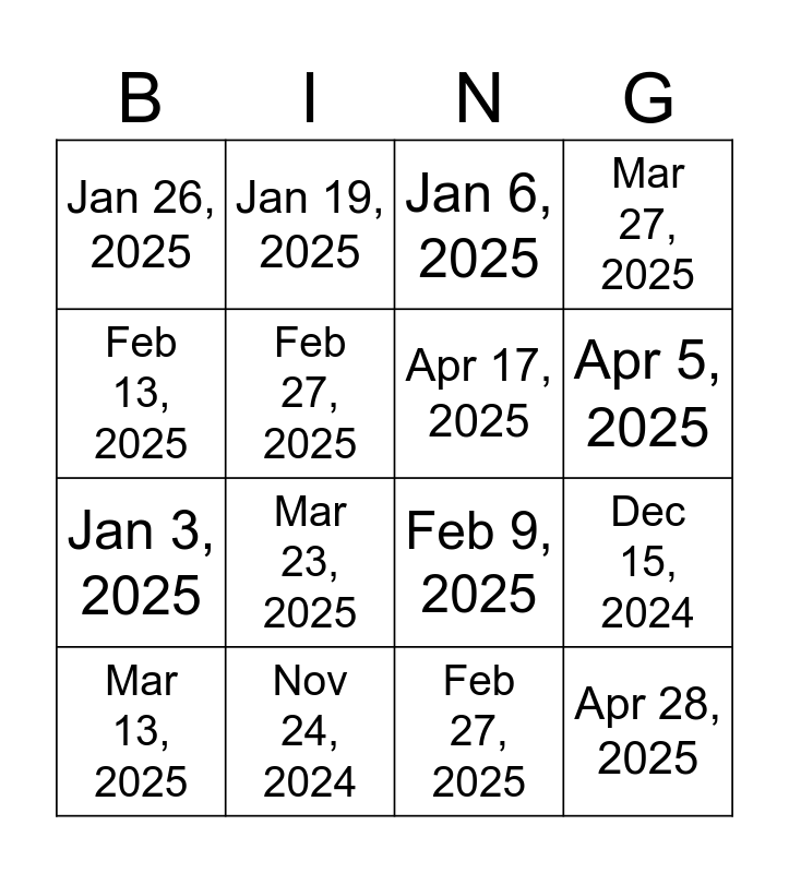 This bingo card has 16 words: Nov 24, 2024, Dec 15, 2024, Jan 6, 2025, Jan 26, 2025, Jan 3, 2025, Jan 19, 2025, Feb 9, 2025, Feb 27, 2025, Feb 13, 2025, Feb 27, 2025, Mar 13, 2025, Mar 27, 2025, Mar 23, 2025, Apr 5, 2025, Apr 17, 2025 and Apr 28, 2025.