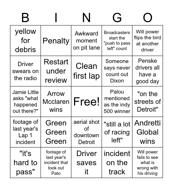 This bingo card has a free space and 24 words: Green Green Green, footage of last year's incident that took out Pato, Clean first lap, "it's hard to pass", Will power flips the bird at another driver, yellow for debris, Driver swears on the radio, Penalty, Palou mentioned as the indy 500 winner, aerial shot of downtown Detroit, Someone says never count out Dixon, Jamie Little asks "what happened out there?", "still a lot of racing left", Andretti Global wins, Restart under review, incident on the track, "on the streets of Detroit", Awkward moment on pit lane, Penske drivers all have a good day, Arrow Mcclaren wins, Will power fails to see what is wrong with his driving, footage of last year's Lap 1 incident, Broadcasters start the "push to pass left" count and Driver saves it.