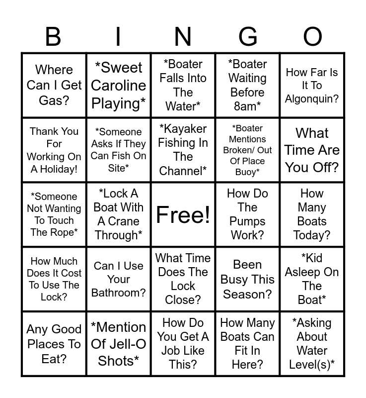 This bingo card has a free space and 44 words: This Is My First Time., *Asking About Water Level(s)*, How Long Does This Take?, Any Good Places To Eat?, *More Than 5 Trump Flags In The Lock At Once*, How Many Boats Can Fit In Here?, *Boater Falls Into The Water*, *Boater Offers Alcohol*, How Far Is It To Algonquin?, *Mention Of Jell-O Shots*, *Boater Waiting Before 8am*, How Do The Pumps Work?, What Time Does The Lock Close?, Can I Use Your Bathroom?, *Jurassic Park Theme Playing*, How Do You Get A Job Like This?, How Many Gallons Does The Lock Hold?, *Someone Not Wanting To Touch The Rope*, *Have To Tell Someone Not To Smoke In The Lock*, What Time Are You Off?, *Sweet Caroline Playing*, *Boat Has Trouble Starting*, *Kidd Rock Playing*, Where Can I Get Gas?, *Mention Of Spiders/Wasps*, How Many Boats Today?, *Ask About A Specific Locktender By Name*, *Lock A Police Boat Through*, Been Busy This Season?, How Much Does It Cost To Use The Lock?, *More Than 4 Dogs In The Lock At Once*, *Kid Asleep On The Boat*, *More Than 7 PWCs At Once*, *Have To Have A Vessel Turn Sideways To Fit Them In*, *Lock A Boat With A Crane Through*, *Lock A Vessel After 11:50pm*, *Vessel Turns Around After Waiting Along Mooring*, *Proud To Be An American Playing*, *Kayaker Fishing In The Channel*, Thank You For Working On A Holiday!, *Boater Mentions Broken/ Out Of Place Buoy*, *Have To Tell Someone Not To Tie-Off In Lock*, *Someone Asks If They Can Fish On Site* and *Receive A Phone Call From Someone Waiting On Mooring*.