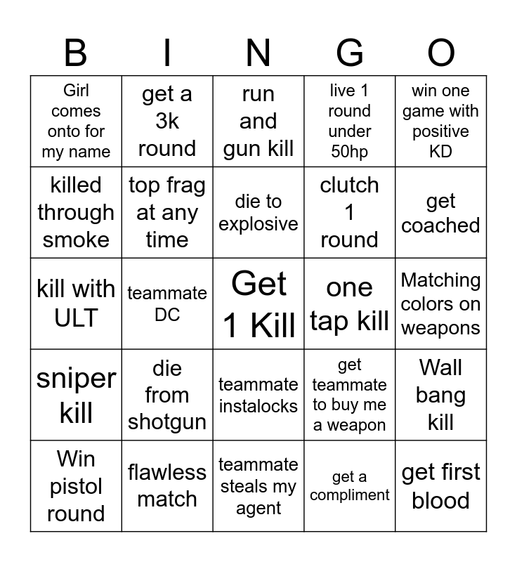 This bingo card has a free space and 24 words: die from shotgun, flawless match, die to explosive, Win pistol round, win one game with positive KD, Girl comes onto for my name, killed through smoke, get a 3k round, one tap kill, teammate instalocks, clutch 1 round, kill with ULT, get teammate to buy me a weapon, Wall bang kill, top frag at any time, get a compliment, Matching colors on weapons, run and gun kill, get coached, teammate DC, get first blood, sniper kill, live 1 round under 50hp and teammate steals my agent.