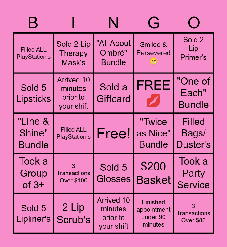 This bingo card has a free space and 24 words: Sold 5 Lipliner's, 3 Transactions Over $100, Sold a Giftcard, Finished appointment under 90 minutes, Sold 2 Lip Primer's, Filled ALL PlayStation's, Sold 2 Lip Therapy Mask's, "All About Ombré" Bundle, "Twice as Nice" Bundle, Filled Bags/ Duster's, "Line & Shine" Bundle, Arrived 10 minutes prior to your shift, $200 Basket, Took a Party Service, Sold 5 Lipsticks, 2 Lip Scrub's, Arrived 10 minutes prior to your shift, Smiled & Persevered 😁, "One of Each" Bundle, Took a Group of 3+, Filled ALL PlayStation's, Sold 5 Glosses, FREE💋 and 3 Transactions Over $80.