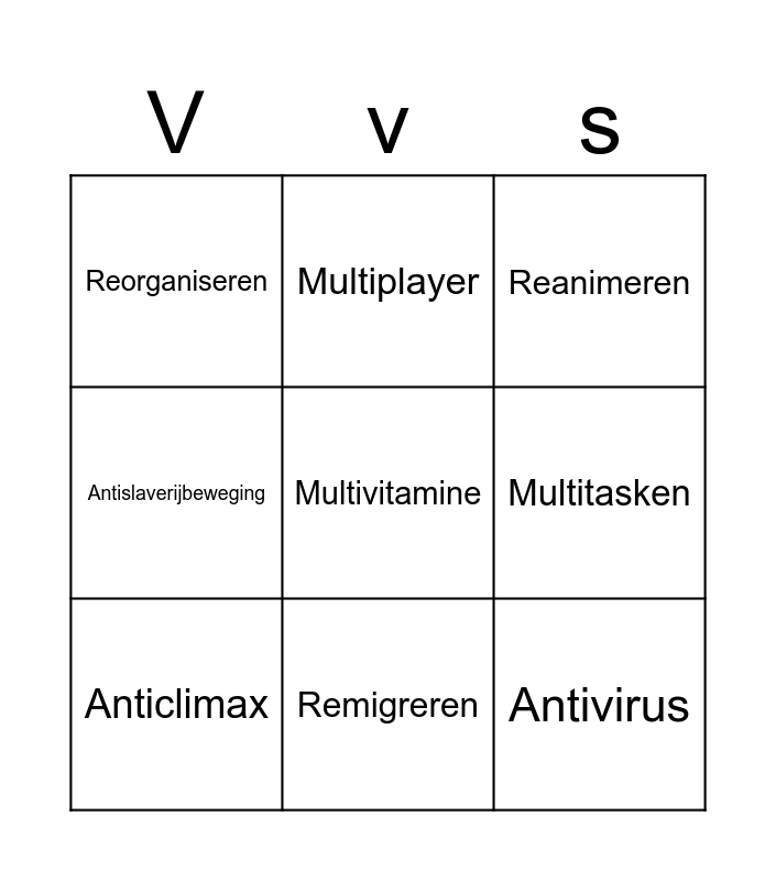 This bingo card has a free space and 8 words: Multitasken, Reanimeren, Multiplayer, Anticlimax, Reorganiseren, Antivirus, Antislaverijbeweging and Remigreren.