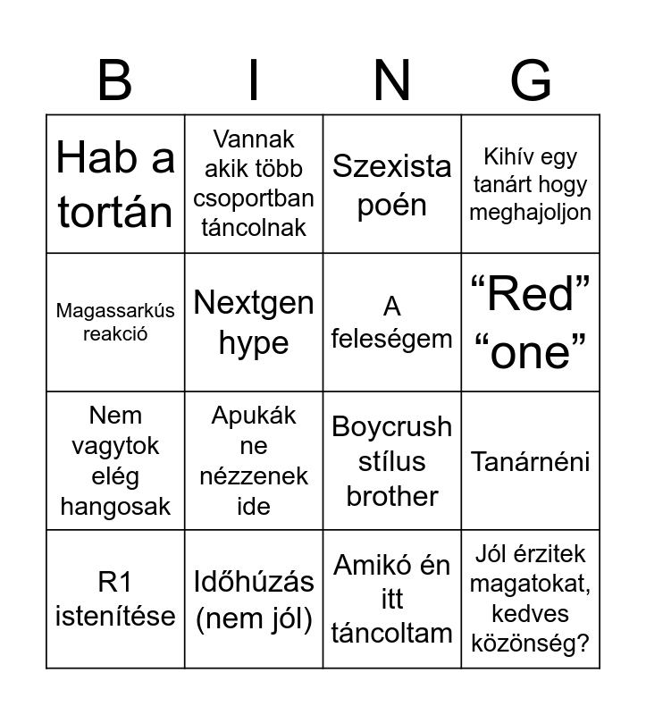 This bingo card has 16 words: Időhúzás (nem jól), Tanárnéni, Szexista poén, Hab a tortán, Nem vagytok elég hangosak, Vannak akik több csoportban táncolnak, Boycrush stílus brother, Amikó én itt táncoltam, Magassarkús reakció, Nextgen hype, R1 istenítése, Kihív egy tanárt hogy meghajoljon, Apukák ne nézzenek ide, “Red” “one”, A feleségem and Jól érzitek magatokat, kedves közönség?.