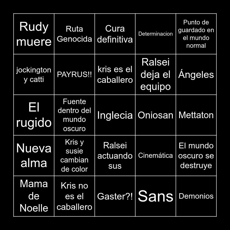 This bingo card has a free space and 24 words: Kris y susie cambian de color, Kris no es el caballero, kris es el caballero, Mama de Noelle, Punto de guardado en el mundo normal, Rudy muere, jockington y catti, Ruta Genocida, Oniosan, Ralsei actuando sus, Ralsei deja el equipo, El rugido, Cinemática, El mundo oscuro se destruye, PAYRUS!!, Sans, Mettaton, Cura definitiva, Ángeles, Fuente dentro del mundo oscuro, Demonios, Nueva alma, Determinacion and Gaster?!.