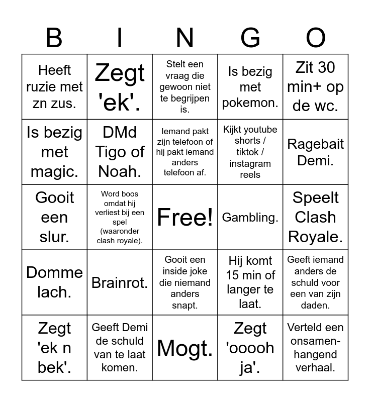 This bingo card has a free space and 24 words: Brainrot., Geeft Demi de schuld van te laat komen., Iemand pakt zijn telefoon of hij pakt iemand anders telefoon af., Zegt 'ek n bek'., Zit 30 min+ op de wc., Heeft ruzie met zn zus., Is bezig met magic., Zegt 'ek'., Gambling., Gooit een inside joke die niemand anders snapt., Kijkt youtube shorts / tiktok / instagram reels, Gooit een slur., Hij komt 15 min of langer te laat., Geeft iemand anders de schuld voor een van zijn daden., DMd Tigo of Noah., Zegt 'ooooh ja'., Speelt Clash Royale., Stelt een vraag die gewoon niet te begrijpen is., Ragebait Demi., Word boos omdat hij verliest bij een spel (waaronder clash royale)., Verteld een onsamen- hangend verhaal., Domme lach., Is bezig met pokemon. and Mogt..