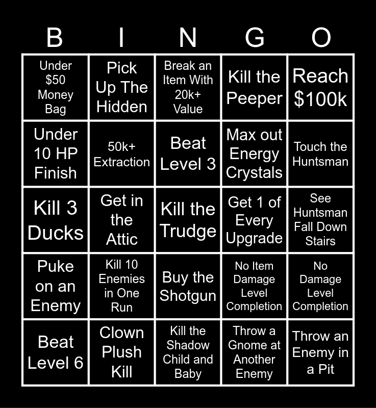 This bingo card has 25 words: Kill 10 Enemies in One Run, Kill the Shadow Child and Baby, Beat Level 3, Beat Level 6, Reach $100k, Under $50 Money Bag, Under 10 HP Finish, Pick Up The Hidden, Get 1 of Every Upgrade, Buy the Shotgun, Max out Energy Crystals, Kill 3 Ducks, No Item Damage Level Completion, No Damage Level Completion, 50k+ Extraction, Throw an Enemy in a Pit, See Huntsman Fall Down Stairs, Break an Item With 20k+ Value, Touch the Huntsman, Get in the Attic, Kill the Trudge, Clown Plush Kill, Puke on an Enemy, Kill the Peeper and Throw a Gnome at Another Enemy.