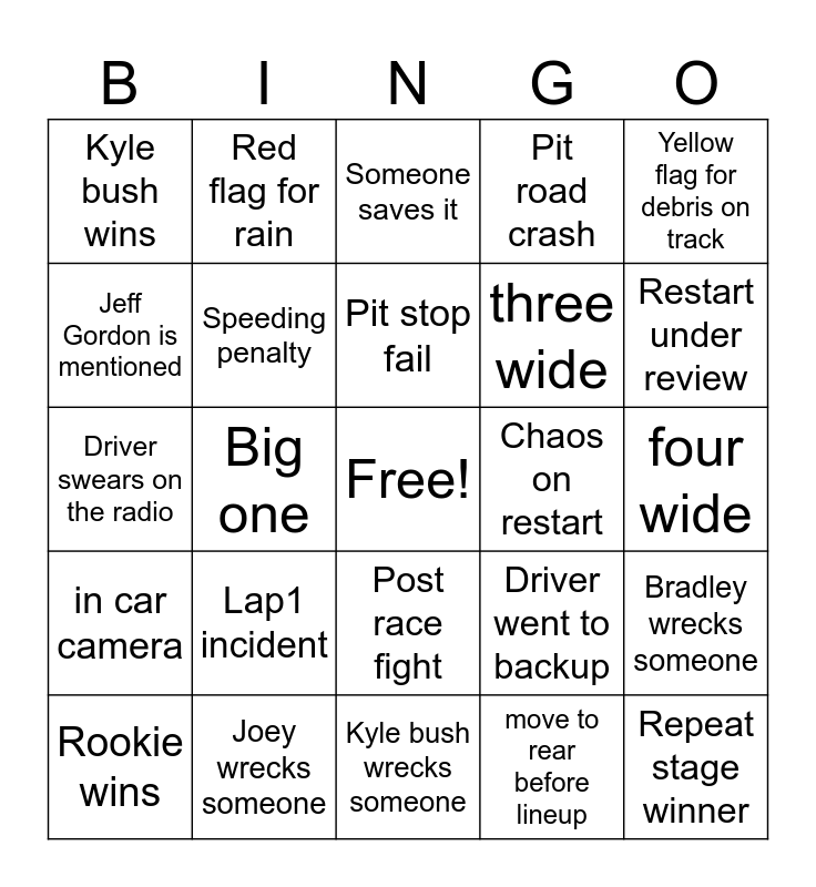 This bingo card has a free space and 24 words: Lap1 incident, Joey wrecks someone, Pit stop fail, Rookie wins, Yellow flag for debris on track, Kyle bush wins, Jeff Gordon is mentioned, Red flag for rain, Chaos on restart, Post race fight, three wide, Driver swears on the radio, Driver went to backup, Bradley wrecks someone, Speeding penalty, move to rear before lineup, four wide, Someone saves it, Restart under review, Big one, Repeat stage winner, in car camera, Pit road crash and Kyle bush wrecks someone.