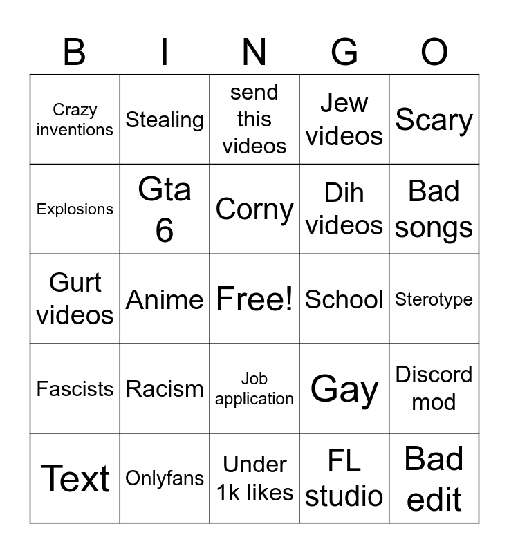 This bingo card has a free space and 24 words: Racism, Onlyfans, Corny, Text, Scary, Crazy inventions, Explosions, Stealing, School, Job application, Dih videos, Gurt videos, Gay, Discord mod, Gta 6, FL studio, Sterotype, send this videos, Bad songs, Anime, Bad edit, Fascists, Jew videos and Under 1k likes.
