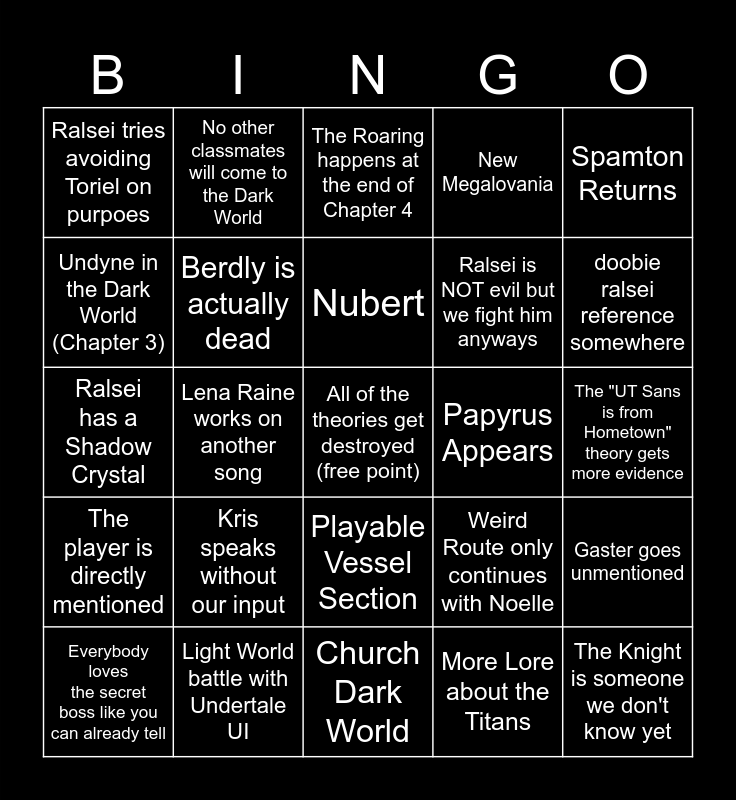 This bingo card has a free space and 24 words: Kris speaks without our input, Light World battle with Undertale UI, Nubert, Everybody loves the secret boss like you can already tell, Spamton Returns, Ralsei tries avoiding Toriel on purpoes, Undyne in the Dark World (Chapter 3), No other classmates will come to the Dark World, Papyrus Appears, Playable Vessel Section, Ralsei is NOT evil but we fight him anyways, Ralsei has a Shadow Crystal, Weird Route only continues with Noelle, Gaster goes unmentioned, Berdly is actually dead, More Lore about the Titans, The "UT Sans is from Hometown" theory gets more evidence, The Roaring happens at the end of Chapter 4, doobie ralsei reference somewhere, Lena Raine works on another song, The Knight is someone we don't know yet, The player is directly mentioned, New Megalovania and Church Dark World.