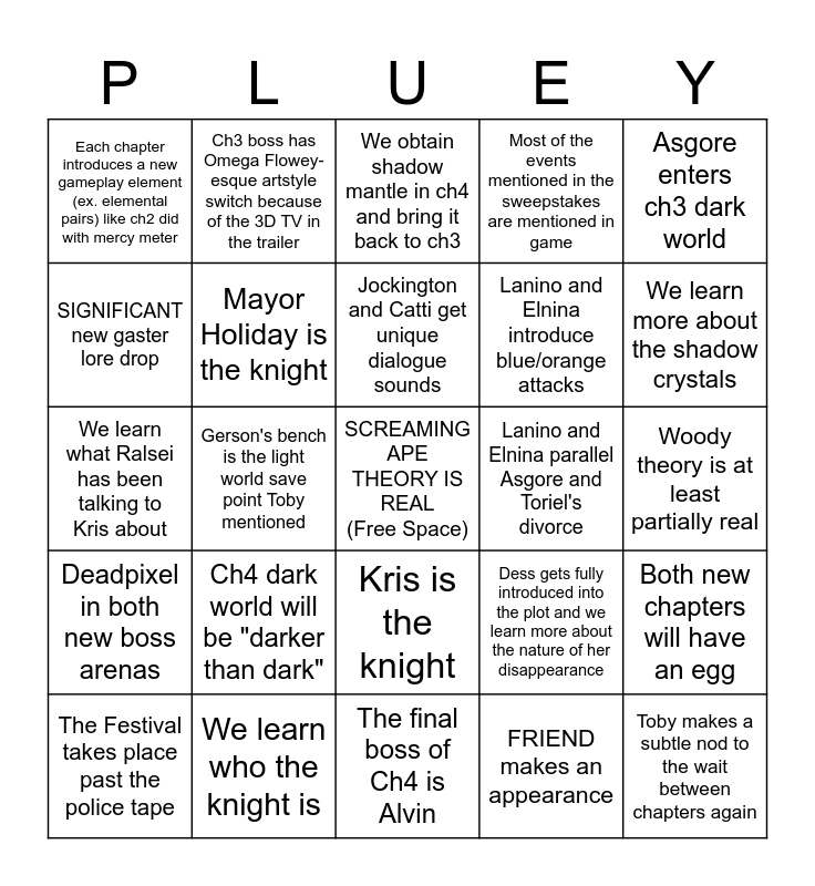 This bingo card has a free space and 24 words: Ch4 dark world will be "darker than dark", We learn who the knight is, Jockington and Catti get unique dialogue sounds, The Festival takes place past the police tape, Asgore enters ch3 dark world, Each chapter introduces a new gameplay element (ex. elemental pairs) like ch2 did with mercy meter, SIGNIFICANT new gaster lore drop, Ch3 boss has Omega Flowey-esque artstyle switch because of the 3D TV in the trailer, Lanino and Elnina parallel Asgore and Toriel's divorce, Kris is the knight, Lanino and Elnina introduce blue/orange attacks, We learn what Ralsei has been talking to Kris about, Dess gets fully introduced into the plot and we learn more about the nature of her disappearance, Both new chapters will have an egg, Mayor Holiday is the knight, FRIEND makes an appearance, Woody theory is at least partially real, We obtain shadow mantle in ch4 and bring it back to ch3, We learn more about the shadow crystals, Gerson's bench is the light world save point Toby mentioned, Toby makes a subtle nod to the wait between chapters again, Deadpixel in both new boss arenas, Most of the events mentioned in the sweepstakes are mentioned in game and The final boss of Ch4 is Alvin.