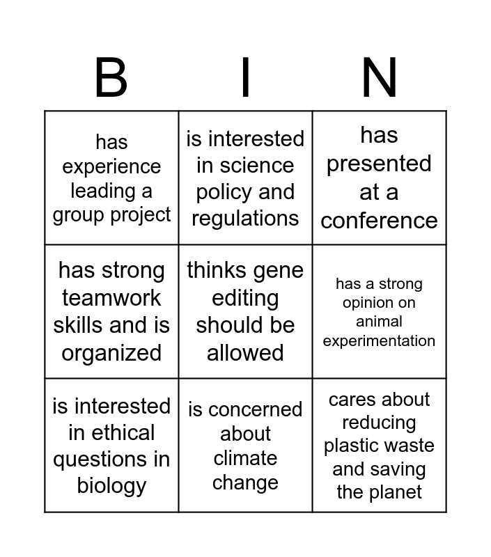 This bingo card has a free space and 8 words: has a strong opinion on animal experimentation, has presented at a conference, is interested in science policy and regulations, is interested in ethical questions in biology, has experience leading a group project, cares about reducing plastic waste and saving the planet, has strong teamwork skills and is organized and is concerned about climate change.