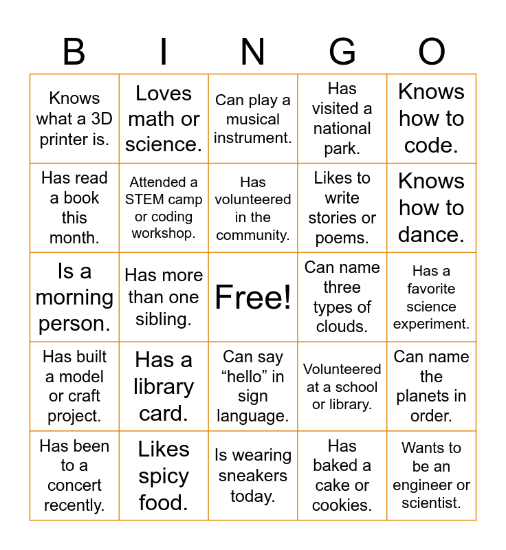 This bingo card has a free space and 74 words: Has traveled to another country., Has a pet at home., Can play a musical instrument., Birthday in my same month., Speaks more than one language., Has met a celebrity., Loves to cook., Is wearing something blue today., Has been to a concert recently., Has a favorite video game., Knows how to swim., Has a unique talent (ask them what it is!)., Has volunteered in the community., Has read a book this month., Is left-handed., Has more than one sibling., Has watched a superhero movie., Knows how to dance., Likes pineapple on pizza., Is a morning person., Attended a STEM camp or coding workshop., Loves math or science., Has visited a national park., Can name all 7 continents., Wants to be an engineer or scientist., Has been camping before., Has a favorite superhero., Likes to draw or paint., Can ride a bike., Plays a sport., Knows how to code., Has been on a plane., Has been in a play or performance., Can whistle a tune., Loves roller coasters., Has baked a cake or cookies., Knows a fun fact about space., Has visited a zoo or aquarium., Can name 5 types of animals., Has been in a talent show., Is wearing sneakers today., Likes spicy food., Has a favorite board game., Has an Instagram or TikTok account., Likes to sing., Knows what a 3D printer is., Can name three U.S. presidents., Has a library card., Has created a video on YouTube., Can recite the alphabet backward., Likes to garden., Has been to a museum., Has a favorite science experiment., Can name a famous inventor., Likes to build with Legos., Visited a state other than their own., Can say “hello” in sign language., Knows what STEM stands for., Has been on a boat or ship., Can name the planets in order., Likes to write stories or poems., Has attended a robotics competition., Has built a model or craft project., Can play chess or checkers., Can name three types of clouds., Favorite animal that’s not a dog or cat., Has played Minecraft or Roblox., Can make a paper airplane., Volunteered at a school or library., Can do a magic trick., Has been to a farm or petting zoo., Has seen a shooting star., Speak alphabet in another language. and Like to wear the color purple..