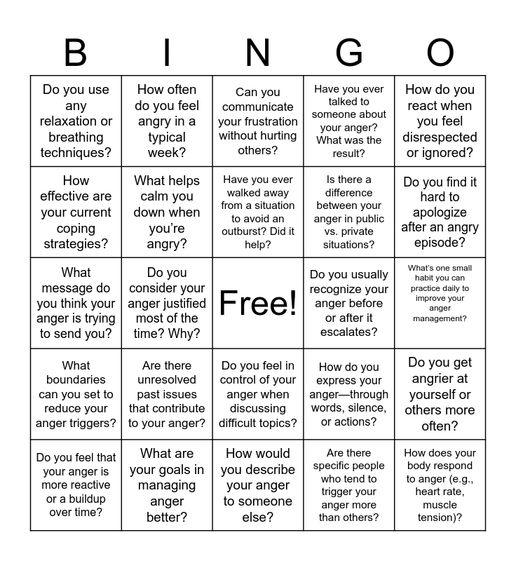 This bingo card has a free space and 50 words: What physical signs do you notice when you're getting angry?, How does your body respond to anger (e.g., heart rate, muscle tension)?, What are the most common situations that trigger your anger?, How would you describe your anger to someone else?, Are there unresolved past issues that contribute to your anger?, What techniques have you tried to manage your anger?, How often do you feel angry in a typical week?, What emotions usually come before your anger?, How effective are your current coping strategies?, Have you ever written down your feelings when you were angry?, What helps calm you down when you’re angry?, Have you ever talked to someone about your anger? What was the result?, Do you get angrier at yourself or others more often?, How do you express your anger—through words, silence, or actions?, What role does your environment (noise, clutter, pressure) play in triggering anger?, How does stress or lack of sleep affect your anger?, Have you ever walked away from a situation to avoid an outburst? Did it help?, Do you usually recognize your anger before or after it escalates?, What unhealthy ways of handling anger do you want to stop using?, How do you react when you feel disrespected or ignored?, Do you consider your anger justified most of the time? Why?, Are there specific people who tend to trigger your anger more than others?, Do you use any relaxation or breathing techniques?, Is there a difference between your anger in public vs. private situations?, Do you tend to raise your voice, withdraw, or lash out?, How do people close to you respond when you’re angry?, Do you find it hard to apologize after an angry episode?, How do you usually resolve conflicts?, Can you communicate your frustration without hurting others?, Do you feel in control of your anger when discussing difficult topics?, What have you learned from previous anger-related situations?, Has anger ever damaged a relationship or opportunity for you?, What would your life look like if you had better control over your anger?, Do you believe anger can ever be helpful or productive?, What are your goals in managing anger better?, Have you ever sought professional help for your anger?, What beliefs or thoughts often fuel your anger?, What does forgiveness mean to you in the context of anger?, How do you want to respond the next time you feel angry?, What’s one small habit you can practice daily to improve your anger management?, How does your anger impact your physical health (e.g., headaches, fatigue)?, What role does social media or news play in triggering your anger?, How do you feel after an outburst of anger—relieved, guilty, ashamed, or something else?, Have you ever felt proud of how you handled your anger? What happened?, Do you feel that your anger is more reactive or a buildup over time?, What message do you think your anger is trying to send you?, How do you differentiate between assertiveness and aggression?, What would someone who knows you well say about your anger?, What boundaries can you set to reduce your anger triggers? and What’s one positive outlet (e.g., exercise, art, journaling) you can use to express your anger?.