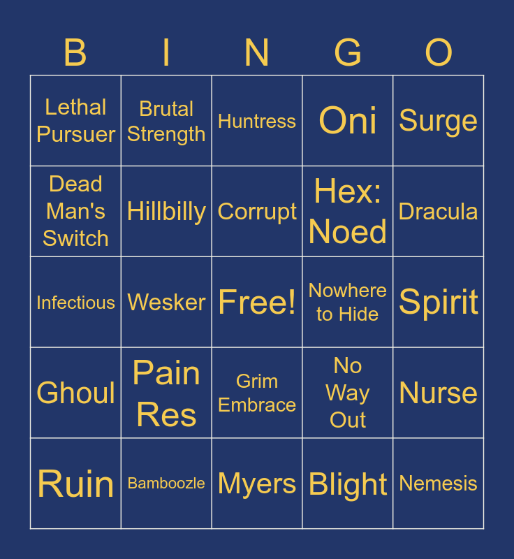 This bingo card has a free space and 24 words: Pain Res, Bamboozle, Corrupt, Ruin, Surge, Lethal Pursuer, Dead Man's Switch, Brutal Strength, Nowhere to Hide, Grim Embrace, Hex: Noed, Infectious, No Way Out, Nurse, Hillbilly, Blight, Spirit, Huntress, Dracula, Wesker, Nemesis, Ghoul, Oni and Myers.