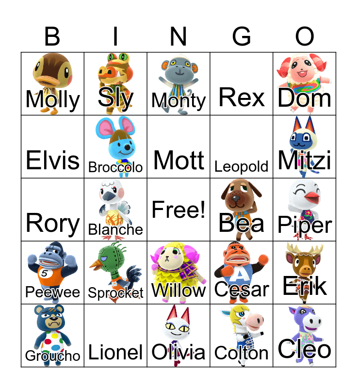 This bingo card has 24 images, a free space and 31 words: Olivia, Lucy, Blanche, Daisy, Molly, Monty, Broccolo, Cesar, Bea, Colton, Piper, Cleo, Chief, Robin, Mitzi, Jitters, Erik, Sprocket, Peewee, Willow, Dom, Alice, Groucho, Sly, Leopold, Elvis, Rex, Rory, Lionel, Mott and Bud.
