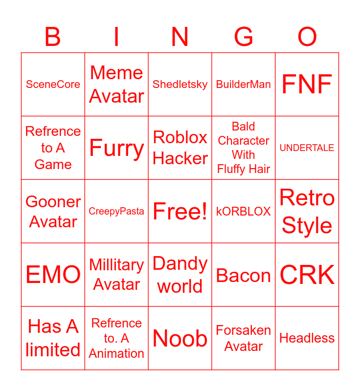 This bingo card has a free space and 24 words: Millitary Avatar, Refrence to. A Animation, Roblox Hacker, Has A limited, FNF, SceneCore, Refrence to A Game, Meme Avatar, kORBLOX, Dandy world, Bald Character With Fluffy Hair, Gooner Avatar, Bacon, CRK, Furry, Forsaken Avatar, Retro Style, Shedletsky, UNDERTALE, CreepyPasta, Headless, EMO, BuilderMan and Noob.