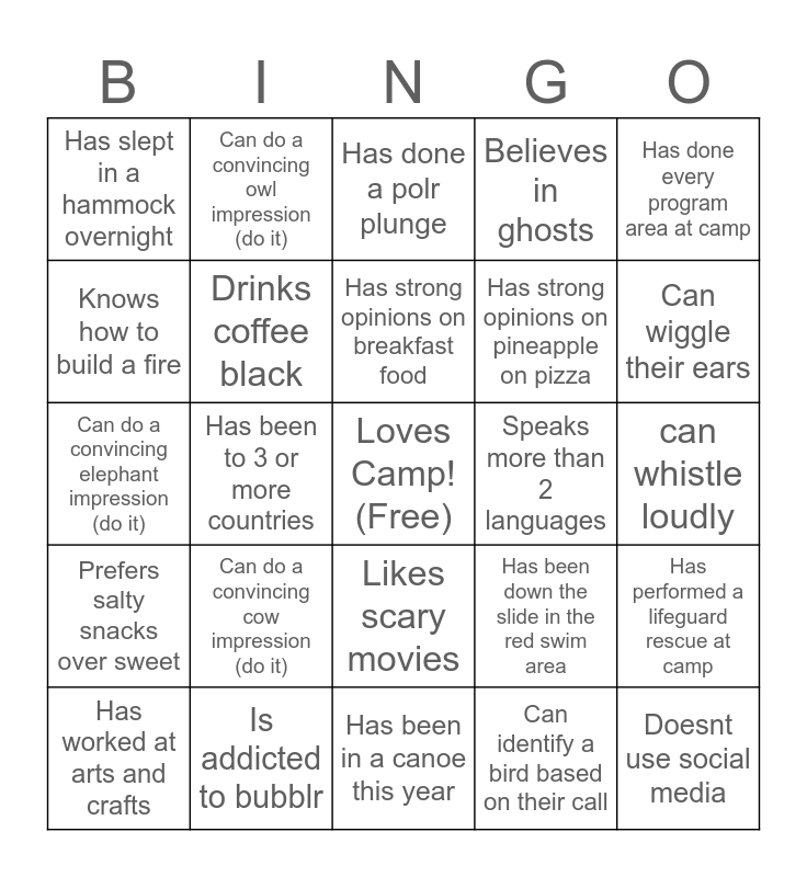 This bingo card has a free space and 98 words: Is left-handed, has more than three siblings, is an only child, can whistle loudly, has worked at a different camp, Is new to camp, Was a camper here, Is afraid of horses, Named after someone (who?), Has a weird hidden talent (show me!), Knows what their name means, Can do a convincing chicken impression (do it), Can do a convincing pig impression (do it), Can do a convincing cow impression (do it), Can do a convincing horse impression (do it), Can do a convincing owl impression (do it), Can do a convincing elephant impression (do it), Can do a convincing dog impression (do it), Can do a convincing Minecraft villager impression (do it), Has defeated the ender dragon, Thinks they could win a fight against a raccoon, Has the same birth month as you, Is a twin, Went to 2+ high schools, Campfire song right now do it, Has slept in a hammock overnight, Has been in a canoe this year, Has worked in the corral, Has worked at the waterfront, Has worked at shooting sports, Has worked at arts and crafts, Knows how to build a fire, Has been at Anokijig for 12+ years, Is a knight, Can wiggle their ears, Can juggle, Believes in ghosts, Sleeps with socks on, Has been to 3 or more countries, Has read the same book 3+ times, Has a favorite podcast, Has strong opinions on breakfast food, Has strong opinions on pineapple on pizza, Has strong opinions on ketchup on a hotdog, Loves reality TV, Likes scary movies, Knows how to sew, Has broken a bone, Has stayed in every North/South section, Has seen a shooting star, Has been on a cruise, Today is their first time at Anokijig, Was a junior staff for 3 years, Can touch their tongue to their nose (DO IT), Has seen their favorite band/singer in concert (who?), Prefers sweet snacks over salty, Prefers salty snacks over sweet, Is a gold knight, Is a silver knight, Sets their alarms with obscure numbers (like 7:03), Is afraid of clowns, Has done the neptune swim, Has a very specific bedtime routine, Would rather be cold than hot, Hates ketchup, Loves mayonnaise, Has seen a bear in the wild, Believes in bigfoot, Believes in the loch ness monster, Can identify poison ivy, Has done a polr plunge, Can start a fire with flint and steel (irl), Can identify a bird based on their call, Took a gap year, Is studying something unrelated to camp, Has the same favorite genre of music as you, Has seen your favorite TV show, Still remembers a school locker combination, Had a webkinz collection, Doesnt use social media, Sends voice memos instead of texts, Drinks coffee black, Is addicted to bubblr, Has been on the trail crafts overnight, Is a program director, Is the voice of the Camp Anokijig voicemail, Has been at camp in the winter, Has driven the safety boat, Has performed a lifeguard rescue at camp, Owns 3+ Anokijig hoodies, Has Anokijig merch that is more than 10 years old, Has been down the slide in the red swim area, Has seen your favorite movie, Is from outside of the midwest, Speaks more than 2 languages, Did lifeguard training this year, Has done every program area at camp and Has never ridden a horse.
