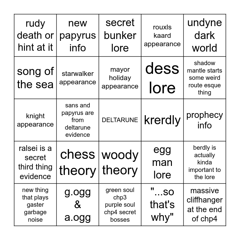 This bingo card has a free space and 24 words: chess theory, g.ogg & a.ogg, mayor holiday appearance, new thing that plays gaster garbage noise, undyne dark world, rudy death or hint at it, song of the sea, new papyrus info, krerdly, woody theory, dess lore, knight appearance, egg man lore, berdly is actually kinda important to the lore, starwalker appearance, "...so that's why", prophecy info, secret bunker lore, shadow mantle starts some weird route esque thing, sans and papyrus are from deltarune evidence, massive cliffhanger at the end of chp4, ralsei is a secret third thing evidence, rouxls kaard appearance and green soul chp3 purple soul chp4 secret bosses.