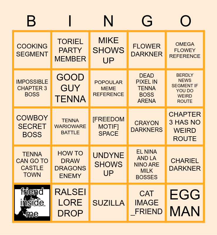 This bingo card has 1 images, a free space and 24 words: HOW TO DRAW DRAGONS ENEMY, RALSEI LORE DROP, POPOULAR MEME REFERENCE, friend inside me, OMEGA FLOWEY REFERENCE, COOKING SEGMENT, IMPOSSIBLE CHAPTER 3 BOSS, TORIEL PARTY MEMBER, CRAYON DARKNERS, UNDYNE SHOWS UP, DEAD PIXEL IN TENNA BOSS ARENA, COWBOY SECRET BOSS, EL NINA AND LA NINO ARE MILK BOSSES, CHARIEL DARKNER, GOOD GUY TENNA, CAT IMAGE _FRIEND, CHAPTER 3 HAS NO WEIRD ROUTE, MIKE SHOWS UP, BERDLY NEWS SEGMENT IF YOU DO WEIRD ROUTE, TENNA WARIOWARE BATTLE, EGG MAN, TENNA CAN GO TO CASTLE TOWN, FLOWER DARKNER and SUZILLA.