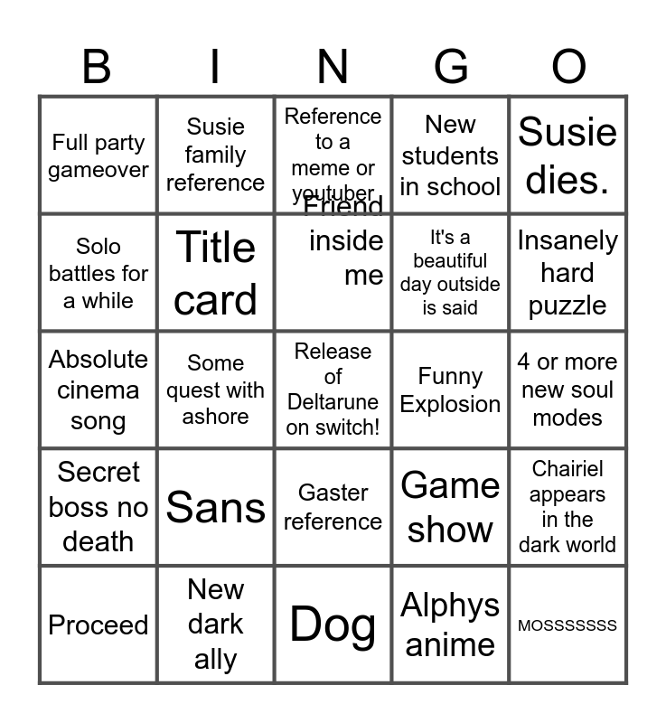 This bingo card has a free space and 44 words: Papyrus mentioned, MOSSSSSSS, Lancer Joins the party fr this time, Proceed, Either spamton or jevil mentioned, Alphys anime, Reference to a meme or youtuber, Snowgrave berdly appearance, Susie dies., New dark ally, New students in school, Funny Explosion, Gaster reference, Sans, Rhythm style puzzle/minigame, Dog, Colored attacks, Absolute cinema song, Wierd route, Insanely hard puzzle, Susie family reference, 3d art, Soul/player appearance, Full party gameover, Tenna dies, 4 or more new soul modes, Flashback, Canon death of a npc(for example berdly during. In chapter 2), Game show, Secret boss no death, Chalk returns, Chairiel appears in the dark world, Casino area?!?, Toriels room, Some quest with ashore, Free fast travel, Dead pixel or wrong color tile, Undertale yellow reference, Friend inside me, Solo battles for a while, It's a beautiful day outside is said, New dark world looks ,clothing/ characteristic, Title card and Green crayon has a comeback.