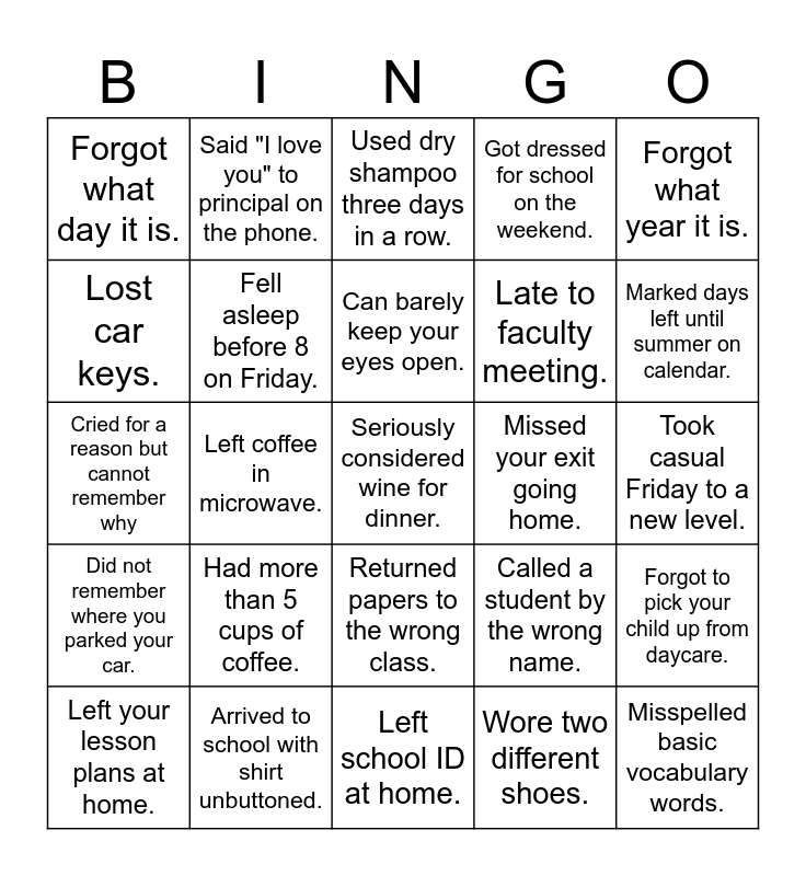 This bingo card has 30 words: Arrived to school with shirt unbuttoned., Chewed gum instead of brushing your teeth., Left coffee in microwave., Forgot route to school., Forgot what day it is., Used dry shampoo three days in a row., Fell asleep before 8 on Friday., Returned papers to the wrong class., Missed your exit going home., Left school ID at home., Took casual Friday to a new level., Seriously considered wine for dinner., Wore two different shoes., Misspelled basic vocabulary words., Marked days left until summer on calendar., Ate leftover donuts for lunch., Called a student by the wrong name., Did not remember where you parked your car., Had more than 5 cups of coffee., Forgot what year it is., Cried for a reason but cannot remember why, Forgot what subject you teach., Said "I love you" to principal on the phone., Late to faculty meeting., Lost car keys., Got dressed for school on the weekend., Forgot to pick your child up from daycare., Left your lesson plans at home., Can barely keep your eyes open. and Fell asleep with your work clothes on..