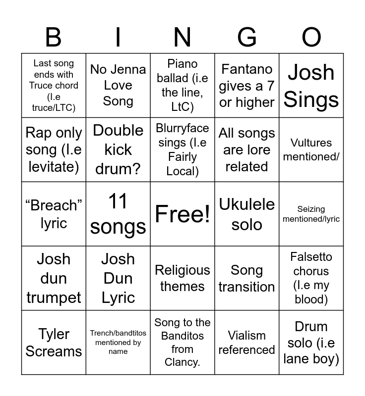 This bingo card has a free space and 24 words: Josh Dun Lyric, Trench/bandtitos mentioned by name, Blurryface sings (I.e Fairly Local), Tyler Screams, Josh Sings, Last song ends with Truce chord (I.e truce/LTC), Rap only song (I.e levitate), No Jenna Love Song, Ukulele solo, Religious themes, All songs are lore related, “Breach” lyric, Song transition, Falsetto chorus (I.e my blood), Double kick drum?, Vialism referenced, Seizing mentioned/lyric, Piano ballad (i.e the line, LtC), Vultures mentioned/, 11 songs, Drum solo (i.e lane boy), Josh dun trumpet, Fantano gives a 7 or higher and Song to the Banditos from Clancy..