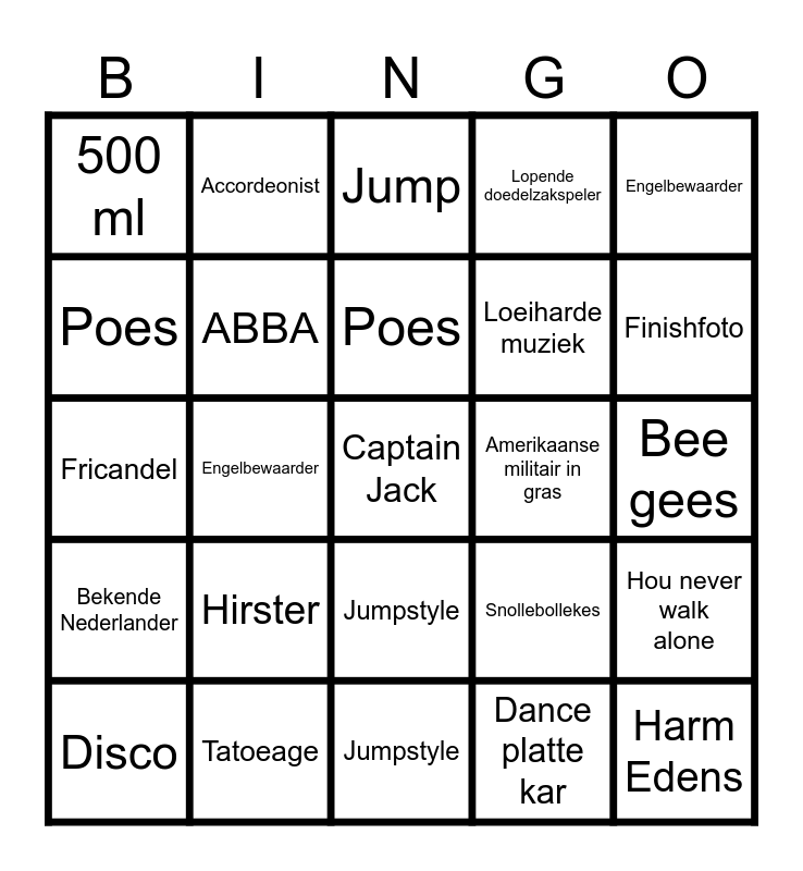 This bingo card has a free space and 24 words: Hirster, Tatoeage, Poes, Disco, Engelbewaarder, 500 ml, Poes, Accordeonist, Amerikaanse militair in gras, Jumpstyle, Loeiharde muziek, Fricandel, Snollebollekes, Hou never walk alone, ABBA, Dance platte kar, Bee gees, Jump, Finishfoto, Engelbewaarder, Harm Edens, Bekende Nederlander, Lopende doedelzakspeler and Jumpstyle.