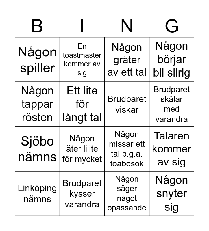 This bingo card has 16 words: Brudparet kysser varandra, Talaren kommer av sig, Någon gråter av ett tal, Någon spiller, Sjöbo nämns, En toastmaster kommer av sig, Någon missar ett tal p.g.a. toabesök, Någon säger något opassande, Någon tappar rösten, Ett lite för långt tal, Linköping nämns, Någon börjar bli slirig, Någon äter liiite för mycket, Brudparet skålar med varandra, Brudparet viskar and Någon snyter sig.