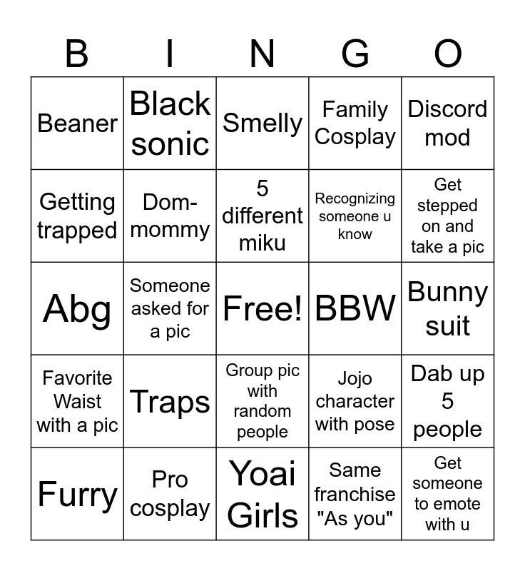 This bingo card has a free space and 24 words: Furry, Traps, 5 different miku, Same franchise "As you", Discord mod, Beaner, Black sonic, Smelly, BBW, Bunny suit, Abg, Dom-mommy, Jojo character with pose, Dab up 5 people, Getting trapped, Pro cosplay, Yoai Girls, Family Cosplay, Get stepped on and take a pic, Favorite Waist with a pic, Someone asked for a pic, Group pic with random people, Recognizing someone u know and Get someone to emote with u.
