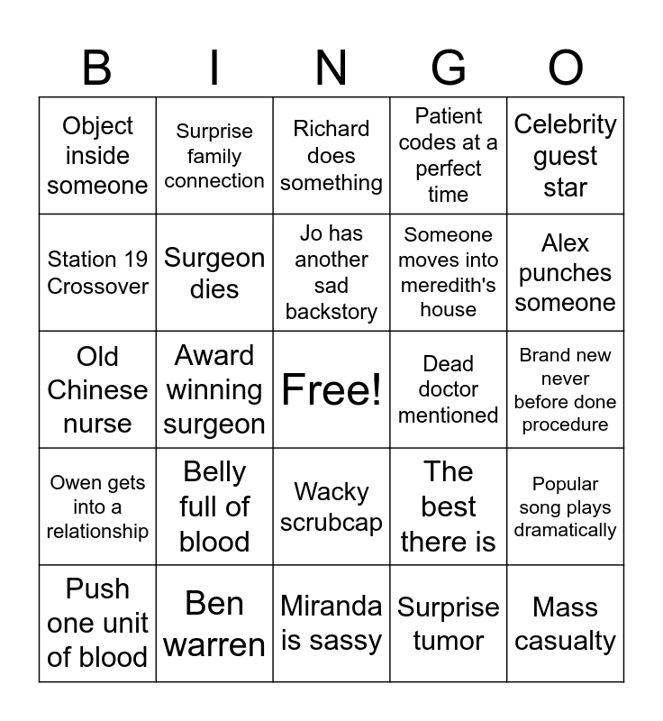 This bingo card has a free space and 24 words: Belly full of blood, Ben warren, Jo has another sad backstory, Push one unit of blood, Celebrity guest star, Object inside someone, Station 19 Crossover, Surprise family connection, Dead doctor mentioned, Wacky scrubcap, Someone moves into meredith's house, Old Chinese nurse, The best there is, Popular song plays dramatically, Surgeon dies, Surprise tumor, Brand new never before done procedure, Richard does something, Alex punches someone, Award winning surgeon, Mass casualty, Owen gets into a relationship, Patient codes at a perfect time and Miranda is sassy.