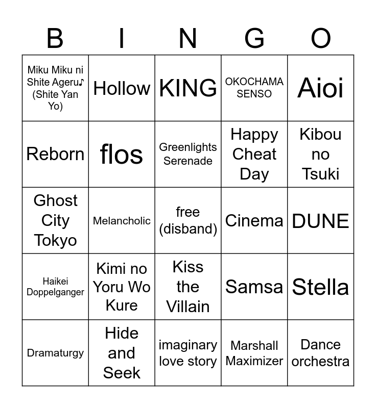 This bingo card has a free space and 24 words: Kimi no Yoru Wo Kure, Hide and Seek, Greenlights Serenade, Dramaturgy, Aioi, Miku Miku ni Shite Ageru♪ (Shite Yan Yo), Reborn, Hollow, Cinema, Kiss the Villain, Happy Cheat Day, Ghost City Tokyo, Samsa, Stella, flos, Marshall Maximizer, DUNE, KING, Kibou no Tsuki, Melancholic, Dance orchestra, Haikei Doppelganger, OKOCHAMA SENSO and imaginary love story.