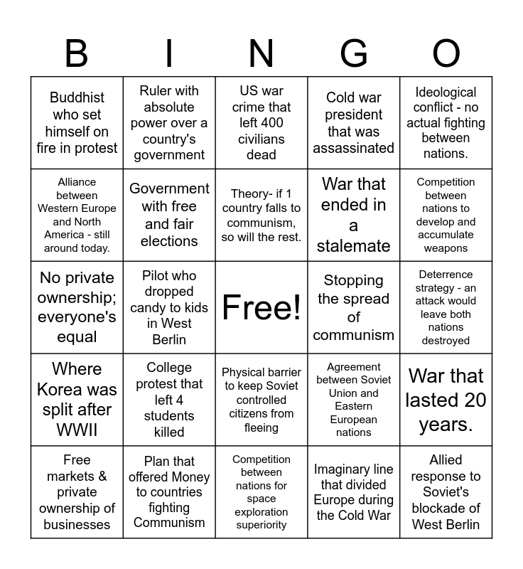This bingo card has a free space and 24 words: College protest that left 4 students killed, Plan that offered Money to countries fighting Communism, Theory- if 1 country falls to communism, so will the rest., Free markets & private ownership of businesses, Ideological conflict - no actual fighting between nations., Buddhist who set himself on fire in protest, Alliance between Western Europe and North America - still around today., Ruler with absolute power over a country's government, Stopping the spread of communism, Physical barrier to keep Soviet controlled citizens from fleeing, War that ended in a stalemate, No private ownership; everyone's equal, Agreement between Soviet Union and Eastern European nations, War that lasted 20 years., Government with free and fair elections, Imaginary line that divided Europe during the Cold War, Deterrence strategy - an attack would leave both nations destroyed, US war crime that left 400 civilians dead, Competition between nations to develop and accumulate weapons, Pilot who dropped candy to kids in West Berlin, Allied response to Soviet's blockade of West Berlin, Where Korea was split after WWII, Cold war president that was assassinated and Competition between nations for space exploration superiority.