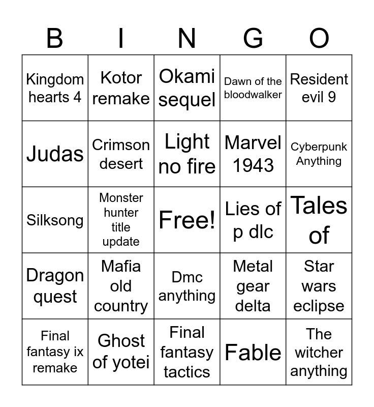 This bingo card has a free space and 29 words: Final fantasy ix remake, Persona 4 remake, Monster hunter title update, Death stranding release date, Kingdom hearts 4, Okami sequel, Crimson desert, Mafia old country, Lies of p dlc, Ghost of yotei, Tales of, The witcher anything, Final fantasy tactics, Fable, Cyberpunk Anything, Star wars anything, Dmc anything, Dragon quest, Resident evil 9, Silksong, Metal gear delta, Pragmata, Marvel 1943, Judas, Dawn of the bloodwalker, Kotor remake, Star wars eclipse, Light no fire and Dying light.