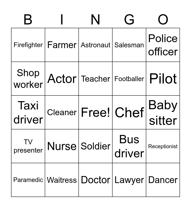 This bingo card has a free space and 25 words: Nurse, Doctor, Teacher, Paramedic, Police officer, Firefighter, Shop worker, Farmer, Chef, Soldier, Footballer, Taxi driver, Bus driver, Receptionist, Actor, Dog walker, Baby sitter, Astronaut, Pilot, Cleaner, Dancer, Waitress, TV presenter, Salesman and Lawyer.
