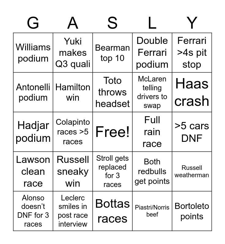 This bingo card has a free space and 24 words: Alonso doesn’t DNF for 3 races, Russell sneaky win, Toto throws headset, Piastri/Norris beef, Ferrari >4s pit stop, Williams podium, Yuki makes Q3 quali, Bearman top 10, Full rain race, >5 cars DNF, Hadjar podium, Hamilton win, Both redbulls get points, Russell weatherman, Antonelli podium, Leclerc smiles in post race interview, Bottas races, Double Ferrari podium, Haas crash, Lawson clean race, Colapinto races >5 races, Stroll gets replaced for 3 races, McLaren telling drivers to swap and Bortoleto points.