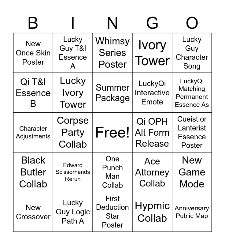This bingo card has a free space and 24 words: Edward Scissorhands Rerun, Lucky Guy Logic Path A, Summer Package, New Crossover, Lucky Guy Character Song, New Once Skin Poster, Qi T&I Essence B, Lucky Guy T&I Essence A, Qi OPH Alt Form Release, One Punch Man Collab, LuckyQi Interactive Emote, Character Adjustments, Ace Attorney Collab, New Game Mode, Lucky Ivory Tower, Hypmic Collab, Cueist or Lanterist Essence Poster, Whimsy Series Poster, LuckyQi Matching Permanent Essence As, Corpse Party Collab, Anniversary Public Map, Black Butler Collab, Ivory Tower and First Deduction Star Poster.