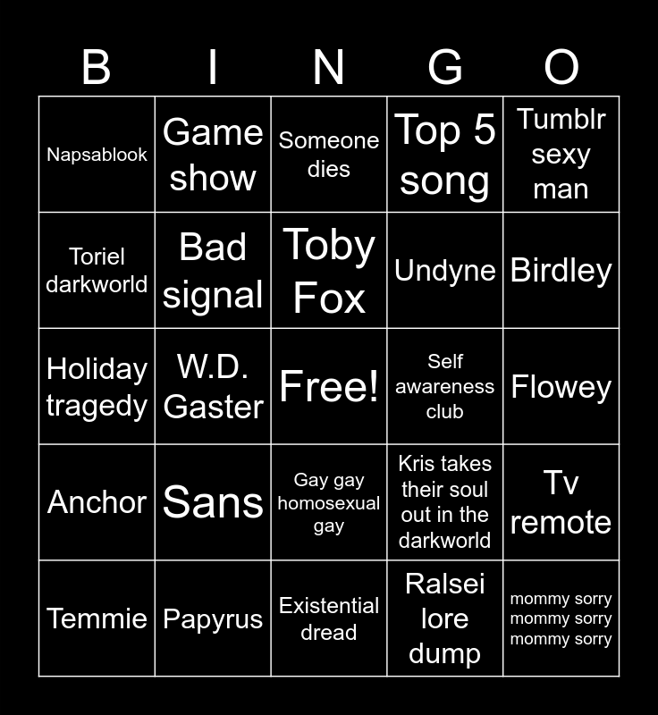 This bingo card has a free space and 24 words: Sans, Papyrus, Toby Fox, Temmie, Tumblr sexy man, Napsablook, Toriel darkworld, Game show, Self awareness club, Gay gay homosexual gay, Undyne, Holiday tragedy, Kris takes their soul out in the darkworld, Tv remote, Bad signal, Ralsei lore dump, Flowey, Someone dies, Birdley, W.D. Gaster, mommy sorry mommy sorry mommy sorry, Anchor, Top 5 song and Existential dread.