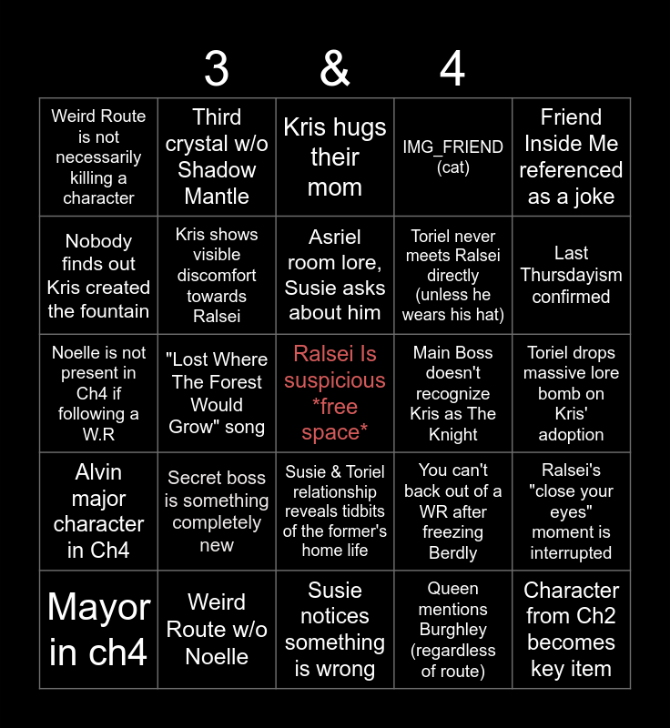 This bingo card has a free space and 24 words: Secret boss is something completely new, Weird Route w/o Noelle, Asriel room lore, Susie asks about him, Mayor in ch4, Friend Inside Me referenced as a joke, Weird Route is not necessarily killing a character, Nobody finds out Kris created the fountain, Third crystal w/o Shadow Mantle, Main Boss doesn't recognize Kris as The Knight, Susie & Toriel relationship reveals tidbits of the former's home life, Toriel never meets Ralsei directly (unless he wears his hat), Noelle is not present in Ch4 if following a W.R, You can't back out of a WR after freezing Berdly, Ralsei's "close your eyes" moment is interrupted, Kris shows visible discomfort towards Ralsei, Queen mentions Burghley (regardless of route), Toriel drops massive lore bomb on Kris' adoption, Kris hugs their mom, Last Thursdayism confirmed, "Lost Where The Forest Would Grow" song, Character from Ch2 becomes key item, Alvin major character in Ch4, IMG_FRIEND (cat) and Susie notices something is wrong.