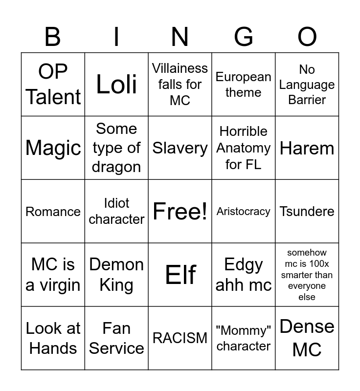 This bingo card has a free space and 24 words: Demon King, Fan Service, Slavery, Look at Hands, No Language Barrier, OP Talent, Magic, Loli, Aristocracy, Elf, Horrible Anatomy for FL, Romance, Edgy ahh mc, somehow mc is 100x smarter than everyone else, Some type of dragon, "Mommy" character, Tsundere, Villainess falls for MC, Harem, Idiot character, Dense MC, MC is a virgin, European theme and RACISM.