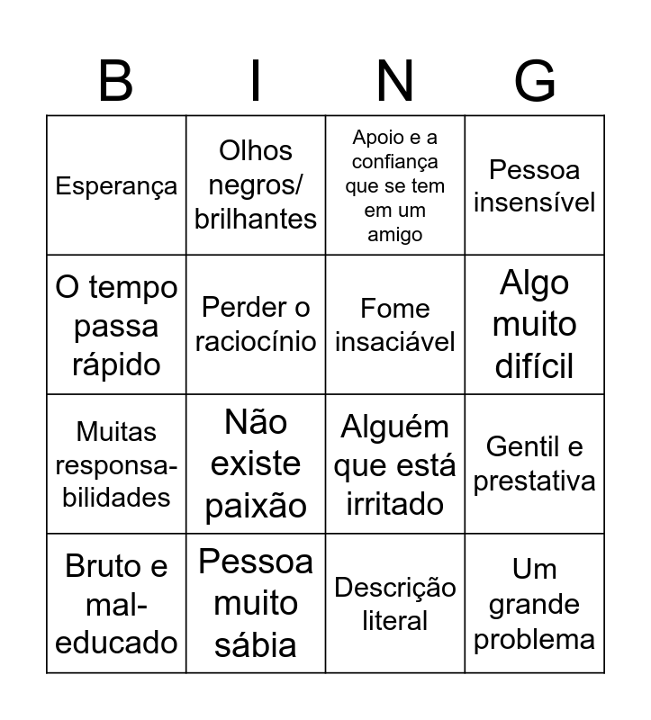 This bingo card has 21 words: Pessoa muito sábia, Cheia de altos e baixos, Olhos negros/ brilhantes, Comparação, não metáfora, Descrição literal, Fome insaciável, Esperança, Apoio e a confiança que se tem em um amigo, Alguém que está irritado, Algo muito difícil, Muitas responsa- bilidades, Pessoa insensível, Um grande problema, Solidão emocional, Perder o raciocínio, Alguém que está muito feliz, Bruto e mal-educado, Não existe paixão, O tempo passa rápido, Gentil e prestativa and Delicadeza.