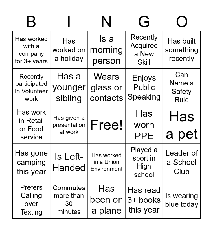 This bingo card has a free space and 30 words: Commutes more than 30 minutes, Speaks more than one language, Has given a presentation at work, Has worked a night shift, Has worked with a company for 3+ years, Is a morning person, Has a younger sibling, Has worked in a Union Environment, Has worn PPE, Has been on a plane, Has a pet, Is wearing blue today, Has read 3+ books this year, Born in another state, Can Name a Safety Rule, Drank coffee today, Played a sport in High school, Has gone camping this year, Is Left-Handed, Has built something recently, Has work in Retail or Food service, Prefers Hands-On Learning, Has worked on a holiday, Enjoys Public Speaking, Recently participated in Volunteer work, Recently Acquired a New Skill, Leader of a School Club, Prefers Calling over Texting, Wears glass or contacts and Salty over sweet.