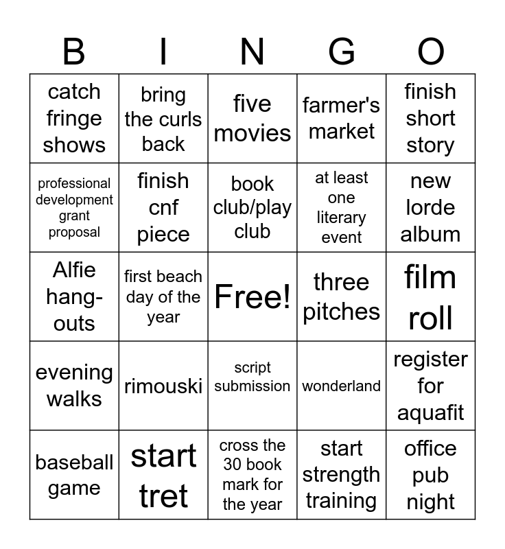 This bingo card has a free space and 24 words: rimouski, start tret, book club/play club, baseball game, finish short story, catch fringe shows, professional development grant proposal, bring the curls back, three pitches, script submission, at least one literary event, Alfie hang-outs, wonderland, register for aquafit, finish cnf piece, start strength training, film roll, five movies, new lorde album, first beach day of the year, office pub night, evening walks, farmer's market and cross the 30 book mark for the year.