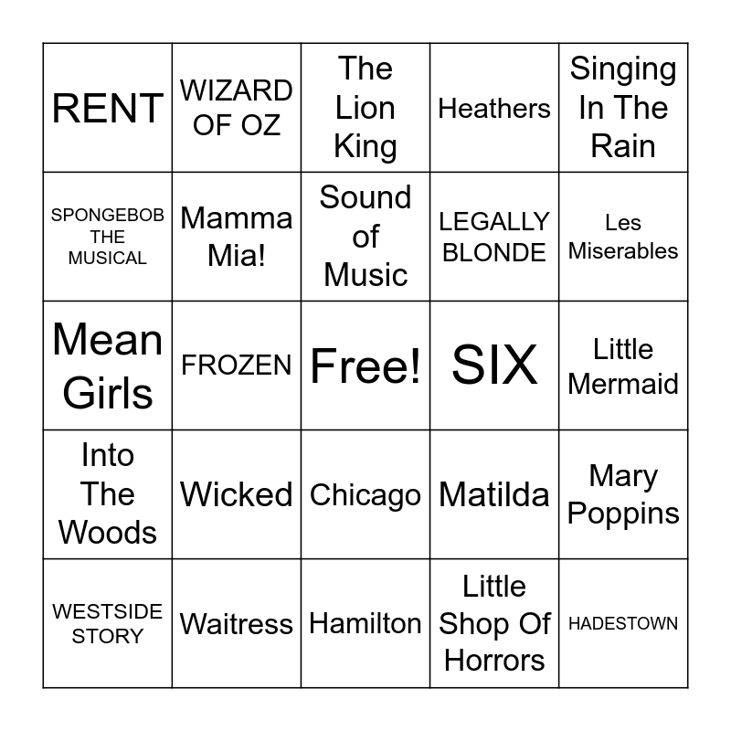 This bingo card has a free space and 24 words: Wicked, Waitress, Sound of Music, WESTSIDE STORY, Singing In The Rain, RENT, SPONGEBOB THE MUSICAL, WIZARD OF OZ, SIX, Chicago, LEGALLY BLONDE, Mean Girls, Matilda, Mary Poppins, Mamma Mia!, Little Shop Of Horrors, Little Mermaid, The Lion King, Les Miserables, FROZEN, HADESTOWN, Into The Woods, Heathers and Hamilton.
